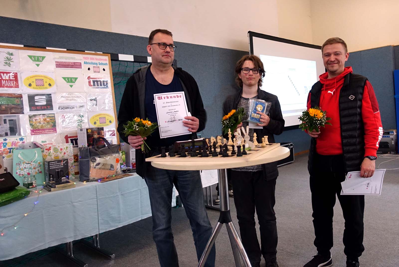 Bereits 2,5 Stunden später stand der neue Osterblitzschachmeister fest. Nach Auswertung der Spiele und dem Drucken der Urkunden, konnte Markus Kaiser von der SG Arnstadt/Stadtilm mit 7,0 Punkten zum diesjährigen Gewinner gekürt werden. Über den 2. Platz freute sich Christian Aepfler von SSV Vimaria 91 Weimar (6,5 Punkte) und Glückwünsche zum 3. Platz nahm Igor Babiy vom SC 1957 Bad Königshofen (6,5 Punkte) freudig entgegen.