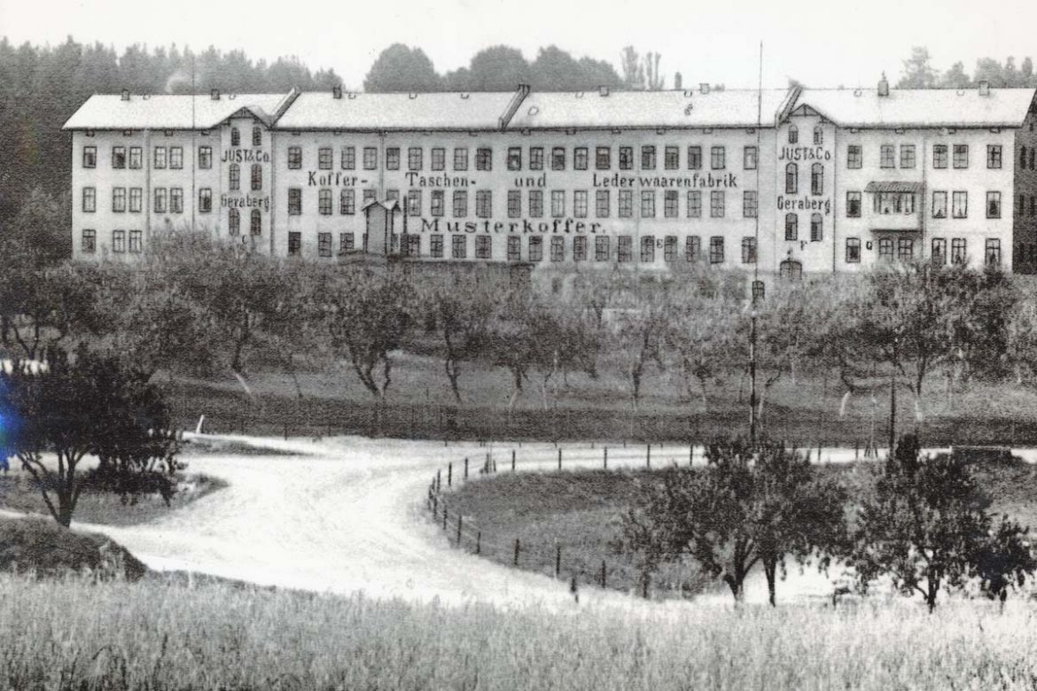 Mit der Erfindung der Dampfmaschine brach das industrielle Zeitalter an. Zwischen Nürnberg und Fürth fuhr 1835 die erste Eisenbahn. Diese neue Art der Fortbewegung sollte auch an Gera(berg) nicht vorbeigehen. 1879 wurde nach Fertigstellung des Eisenbahnviaduktes über Angelroda die Strecke Arnstadt-Ilmenau eröffnet. Gera(berg) profitierte von diesem Bahnanschluss, weil sich nun auch Industrie ansiedeln konnte. Diese Aussichten eröffneten neue Perspektiven für Handel und Transport. Sie veranlaßten Herrn Hugo Just, welcher 1887 in Arlesberg eine Fabrik für Holzkoffer und-Kisten neben dem Thermometerwerk Keiner, Schramm & Co. (sein Hauptwerk war in Leipzig) bauen ließ, sich generell nach Gera(berg) zu orientieren. Er kaufte 1895 von der Gemeinde Gera ein Grundstück auf dem „Geraberg“, 1896 entstand ein mehrstöckiges Wohnhaus und bis 1898 wurden zwei große Fabrikteile angebaut. Er verlagerte seine Kofferfabrik von Leipzig nach Gera. Außen war folgender Schriftzug angebracht: „Just & Co. Geraberg Koffer-, Taschen- und Lederwarenfabrik“.