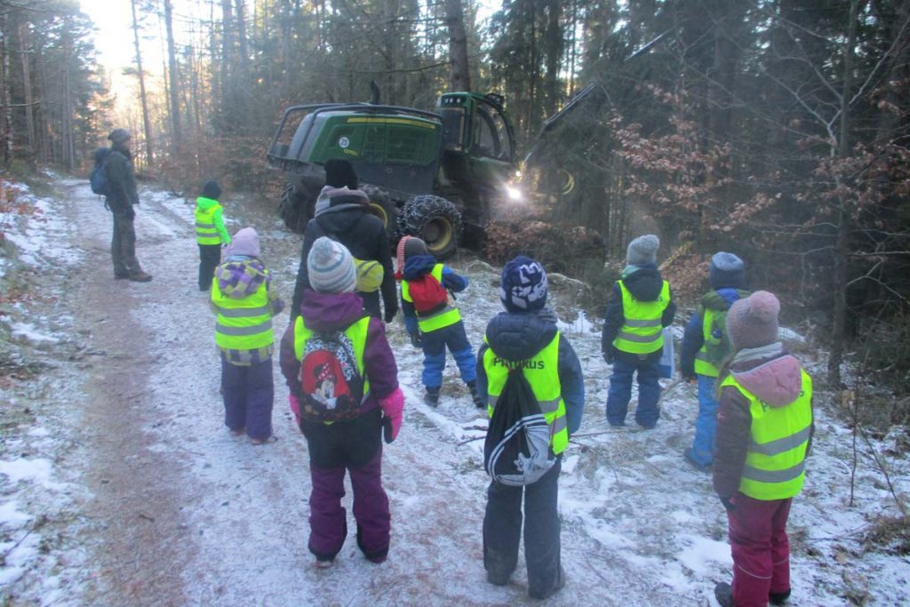 - im Wald wartetet bereits ein Waldarbeiter, welcher den Kindern die Kunst seiner Rückemaschine genau zeigte; Bäume fällen und zerschneiden schien ein Kinderspiel zu sein; als die Kinder ihre eigene Größe mit denen der Räder sowie der ganzen Maschine messen und sogar in dieses Kraftpaket einsteigen durften, war die Begeisterung riesig
