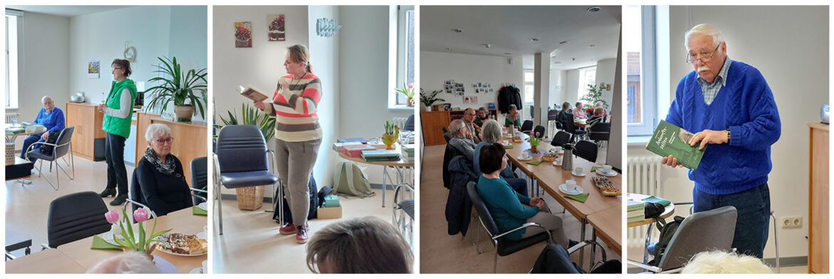 Evelin Günther leitete anhand von Kurzgeschichten, welche sie selbst beobachtet hatte zum Jahrbuch hinüber, aus dem sie vorlas. Lustige Geschichten und Gedichte wechselten sich ab. Auch in der Satire – Der Säbelzahntiger – hielt sie den Menschen einen Spiegel vor. Mit ihrem neuesten Buch – Kirchenkoboldgeschichten – für Kinder und Erwachsene, beendete sie die Lesung.