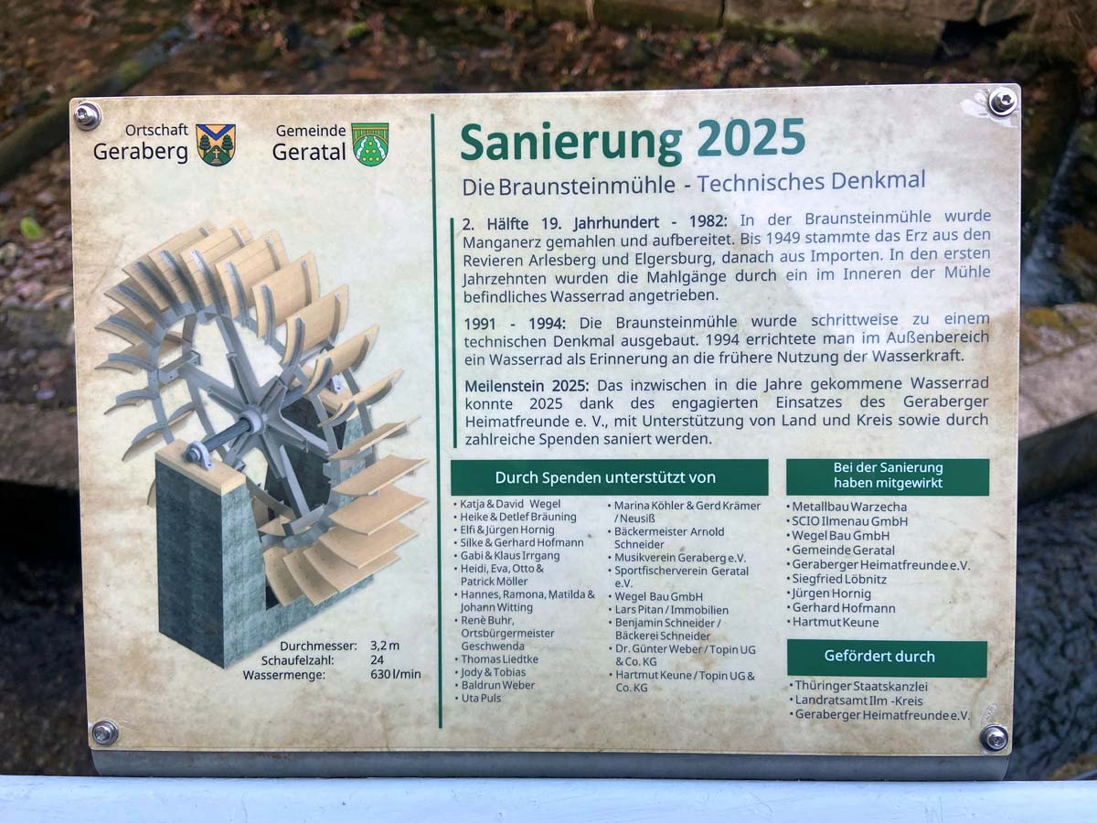 Für ihren unermüdlichen Einsatz wurden die Geraberger Heimatfreunde mit einem größeren, elektrisch betriebenen Mühlrad geehrt. Eine kleine Informationstafel direkt neben dem Mühlrad erinnert fortan an alle Unterstützer dieses Projektes.