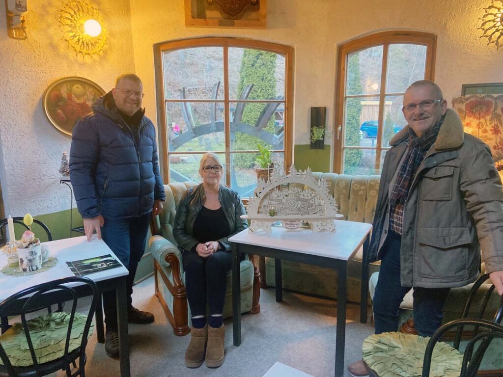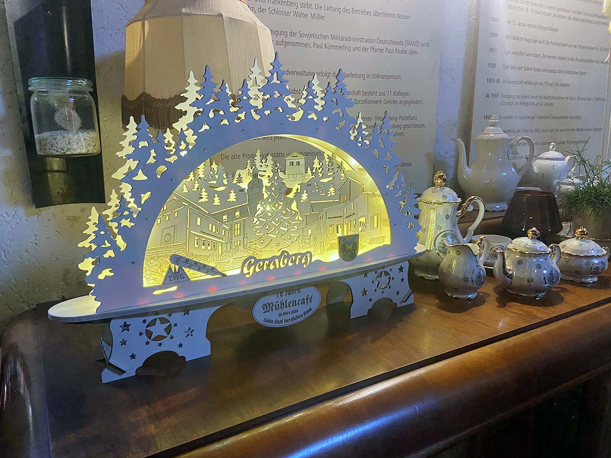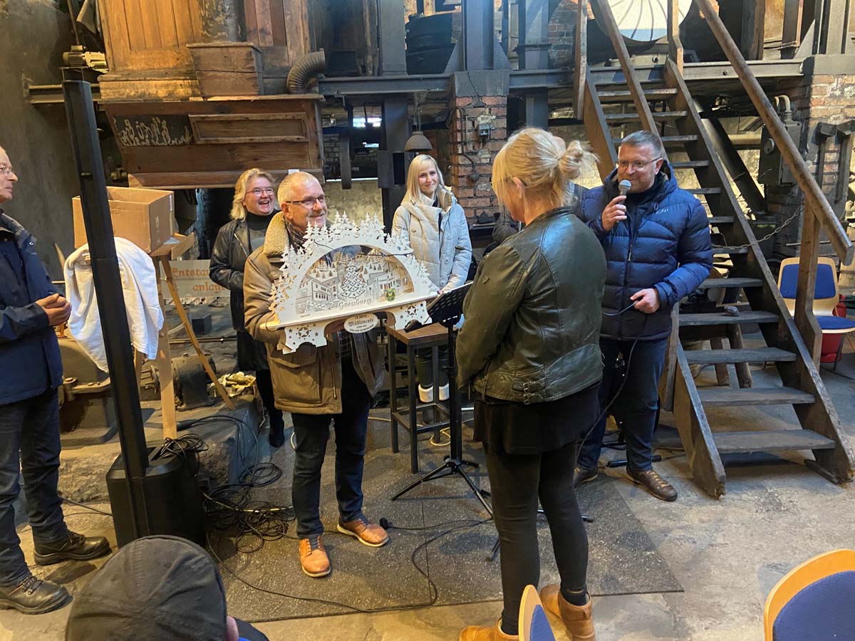 Auch Daniela Wiegand, Betreiberin des Mühlencafés, wurde an diesem Abend geehrt. Für ihr 16-jähriges Engagement und die damit verbundene nachhaltige Bereicherung der Braunsteinmühle überreichten Dominik Straube und Detlef Bräuning ihr einen Schwibbogen, der sich künftig harmonisch in das liebevoll eingerichtete Café einfügen wird. Sichtlich gerührt nahm sie das Präsent entgegen.