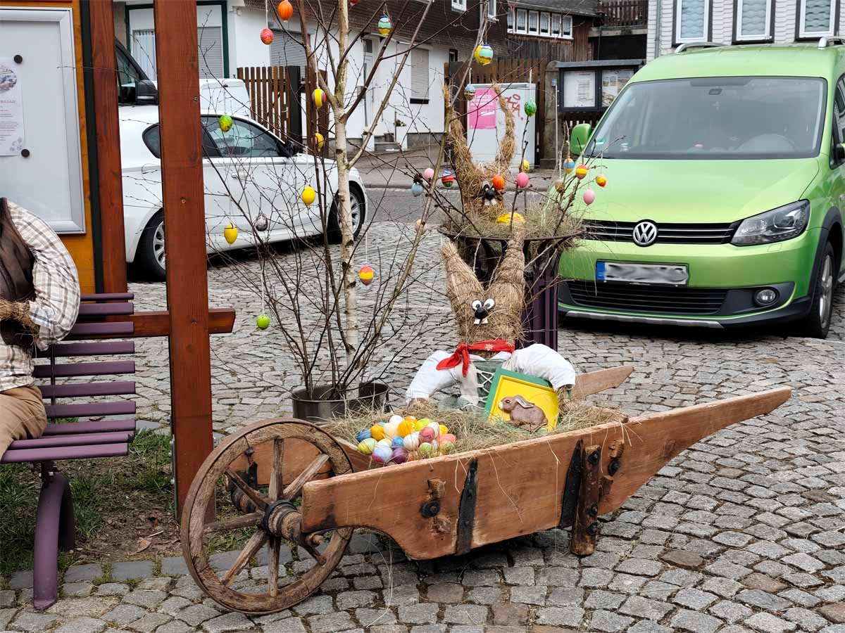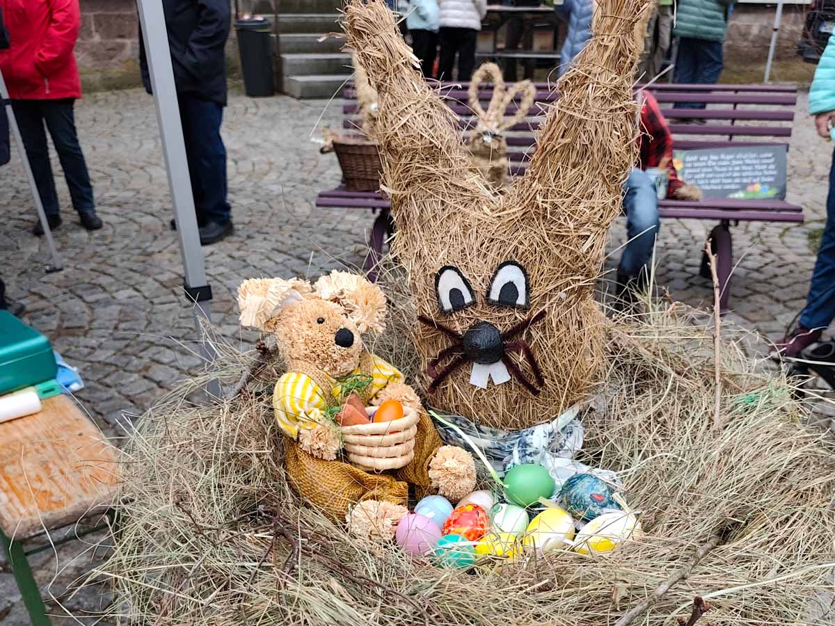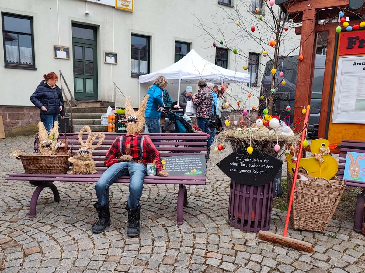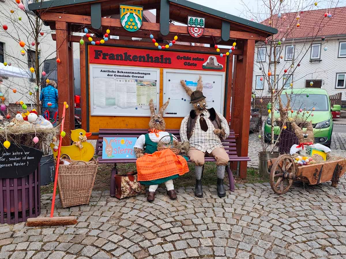 Die Frankenhainer wurden aufgerufen, den Osterbasar durch Bereitstellung österlicher Sachen und Kinderspielzeug zu unterstützen. Es kam einiges zusammen, für manches wurde sich interessiert. Nach der getanen Arbeit wurden die Helfer und die Frankenhainer herzlich eingeladen, das schöne Osterbild des Plans beim Verzehr von Bratwurst und Getränken zu genießen und zu bestaunen.