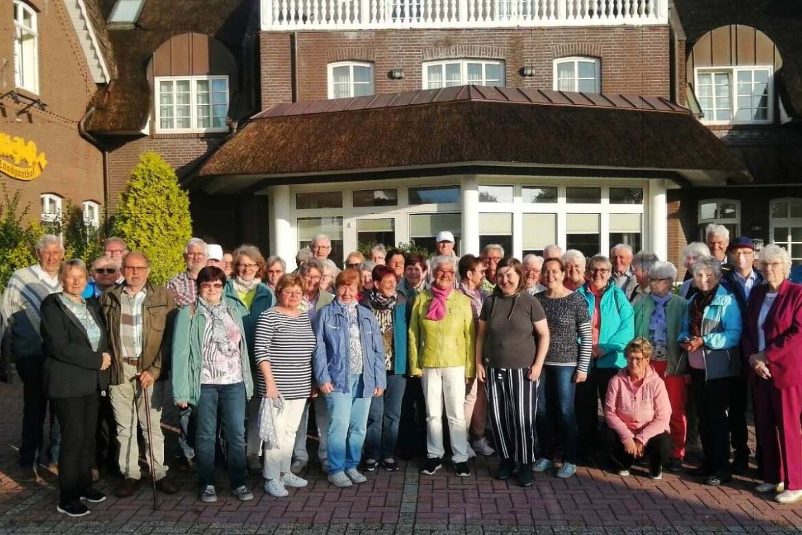 Der erste Tag unserer fünftägigen Reise musste leider für „777 Jahre Geraberg“ hergegeben werden. So fuhren wir am Montag mit 48 Sängern, deren Anhang und einigen Fans mit unserem neuen Busfahrer Dirk erst nach Westen, dann nach Norden, vorbei am Harz, Lüneburger Heide und Ammerland. Zwei Stunden mit zähem Auto-bahnverkehr sind heute wohl nicht zu vermeiden. Sie konnten uns aber nicht verdrießen. Gemischtes Wetter war angesagt, der Himmel wurde immer größer und weiter, und die Wolkengebilde immer schöner. Natürlich durften auch auf dieser Reise unsere Kuchenpausen nicht fehlen. Noch am hellen Abend trafen wir dann im großen reetgedeckten Nobelhotel, dem „Landgasthof zur alten Post“ in Aurich-Ogenbargen ein. Reisemüdigkeit nach dem Abendessen versagten uns Schwimmbad, Sauna und allgemeine Geselligkeit.