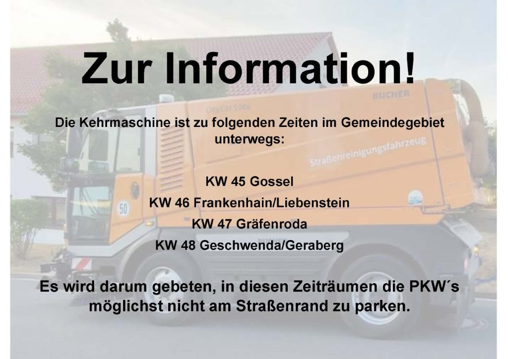 um einen reibungslosen Ablauf der StraĂŸenreinigung zu ermöglichen, möchten wir die Anwohner in der jeweiligen Ortschaften darum bitten, ihr Fahrzeuge in den Kalenderwochen, in denen die StraĂŸenreinigung erfolgt, nicht an den StraĂŸen abzustellen.