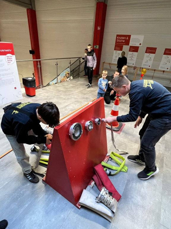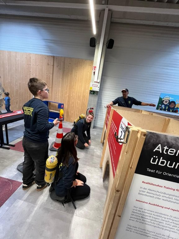 - Eine kindgerechte Atemschutzübungsstrecke, bei der die Teilnehmer mit extra für Kinder gebauter Atemschutzausrüstung ausgestattet wurden. Sie mussten Schläuche kuppeln und einen kleinen Hindernisparcour bewältigen. Dies war ein spielerischer Einstieg in die Technik und Koordination der Feuerwehrarbeit.