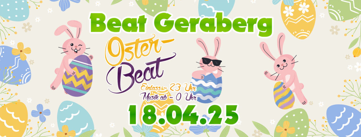 Sperrt die Löffelohren auf! 🐇 Am 18.04.25 ist wieder Zeit für Beat Geraberg! Anlässlich zu Ostern legt der Beat sein buntes Oster-Gewand an. 🥚 Mit einer Mischung aus aktuellen Tracks aber auch echten Beat-Klassikern klappt die Eiersuche fast wie von selbst! Bitte beachtet, dass der Einlass diesmal 23 Uhr ist und wir mit der Musik ab 0 Uhr beginnen.🕰 Also kommt vorbei gehoppelt für eine Einstimmung aufs Osterfest! 🐣