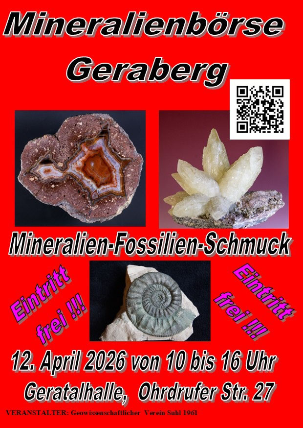 Geratalhalle Geraberg Ohrdrufer Straße 27, 99331 Geratal OT GerabergEs gibt Gutes zu Berichten. Bald findet auch dieses Jahr die Börse für Mineralien, Fossilien und Bergbauzubehör wieder statt. Am 12.04. 2026…