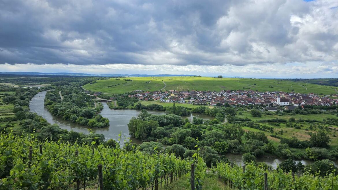 Wir wurden herzlichst empfangen und erstmal mit einem Gläschen Secco verwöhnt. Von wegen schon wieder Sitzen, war nicht drinne, nein es ging gemeinsam mit dem Winzer hinauf in die Weinberge, die sich malerisch an den kleinen Ort anschmiegten. Unsere betagten Anglerfreunde durften unten im Winzerhof, unter einer gemütlichen Veranda, sitzen bleiben. Bei einem Gläschen Wein und angenehmen Temperaturen war dies schon ein kleiner Luxus. Wir anderen stapften munter in die Weinberge hinauf, wo auf einer tollen Aussichtsplattform schon das nächste Gläschen Wein auf uns wartete. Mehrere Sorten verkosteten wir inmitten der Weinberge. Immer wieder ging ein Ah und Oh durch die Reihen. Bloß gut, dass das Wetter nicht zu heiß war, sonst wäre wohl manch Einer im Weinberg hocken geblieben.