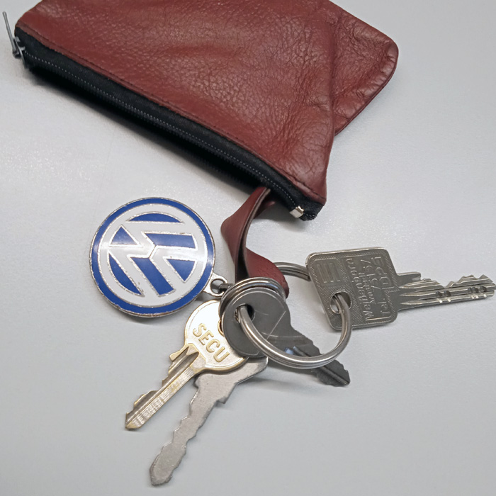 Schlüsselbund mit 4 Schlüsseln, VW-Anhänger und kl. weinroter Tasche