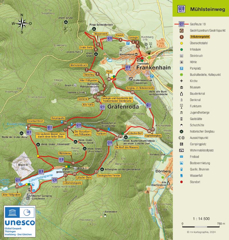 Der Rundwanderweg startet am GeoPark-Zentrum in der Mühlsteinstraße 7 im Ortsteil Frankenhain in 99331 Geratal.