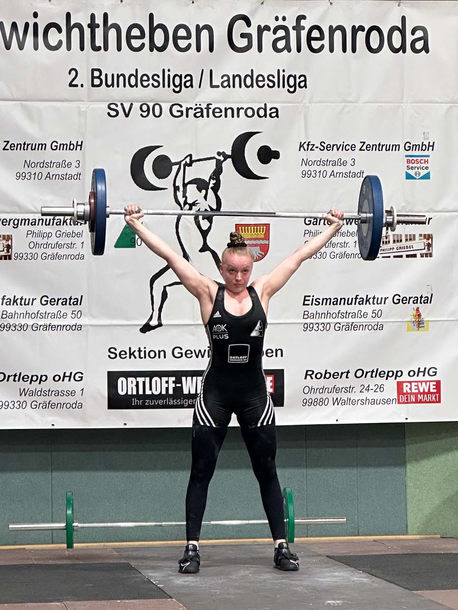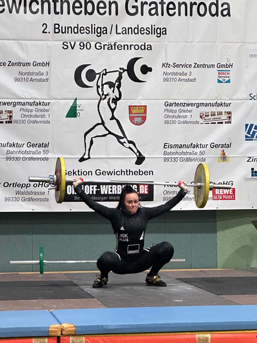 Carolin Geuther 101 Relativpunkte (57,60 kg Körpergewicht/146 kg Zweikampf-65 kg Reißen/81 kg Stoßen)