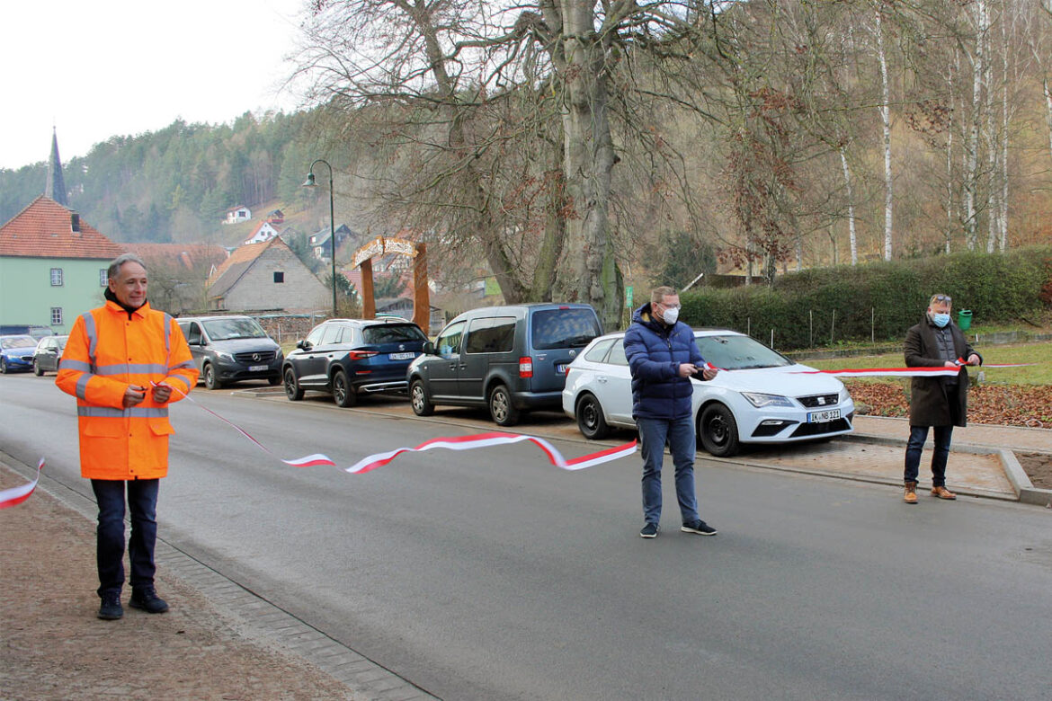 Dazu wurde mit Volker Geimecke (Thüringer Landesamt für Bau und Verkehr) symbolisch das Band durchschnitten, welches sinnbildlich für die über zwei Jahre andauernde Sperrung der Ortsdurchfahrt stand.
