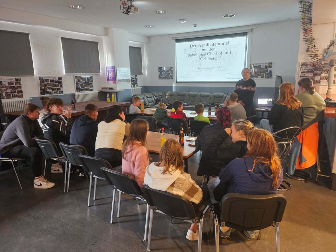 Stefan Wespa Eisenbahnhistoriker aus Elgersburg hatte in seinem dritten Buch, anlässlich des 140jährigen Bestehens des längsten Eisenbahntunnels der Deutschen Reichsbahn, dem Brandleitetunnel, auch viele interessante Bilder von den Bahnhöfen Gehlberg und Oberhof zu zeigen. 20 Kinder und Jugendliche hörten von ihm einige Geschichten und bestaunten die alten Bilder auf der Leinwand in der Jugendeinrichtung.