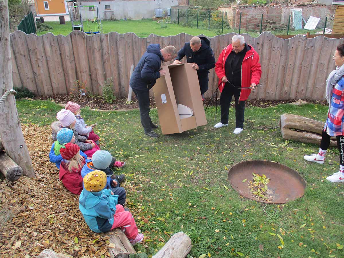 Im Rahmen ihrer Kindergarten-Tour besuchte uns die CDU-Fraktion des Gemeinderates der Landgemeinde Geratal Anfang November. Im Gepäck hatten Sie einen großen Suppentopf samt Dreibein für unser Lagerfeuer. Diesen hatten wir schon länger auf unserer Wunschliste. Überbracht wurde die Spende durch drei Mitglieder der Fraktion: Bürgermeister Dominik Straube, Lars Pitan (2. Beigeordneter Gemeinde Geratal) und Andreas Gundermann (ehemaliger Ortschaftsbürgermeister von Gossel). Der Topf wurde an Ort und Stelle aufgebaut und sehr gerne hätten die Kinder gleich ein Süppchen im Freien geschlürft.