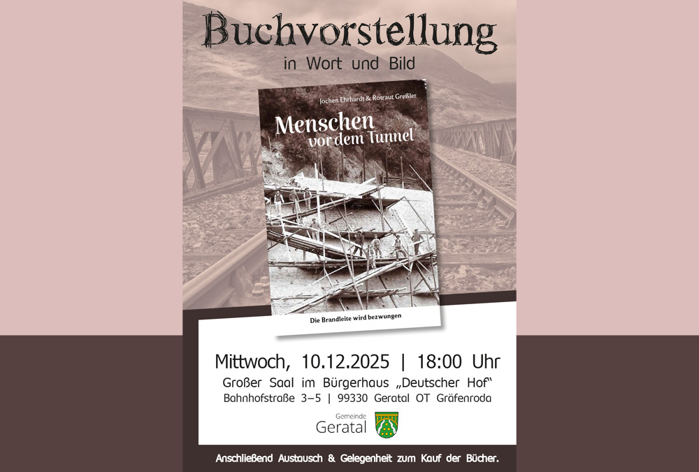Mit ihrem neuesten Werk „Menschen vor dem Tunnel – die Brandleite wird bezwungen. Geschichtliche Betrachtungen im Tal der Wilden Gera“ widmen sie sich einem besonderen Kapitel der regionalen Geschichte: Dem Bau des Brandleitetunnels, der 1884 mit Unterquerung des Rennsteigs eröffnet wurde.