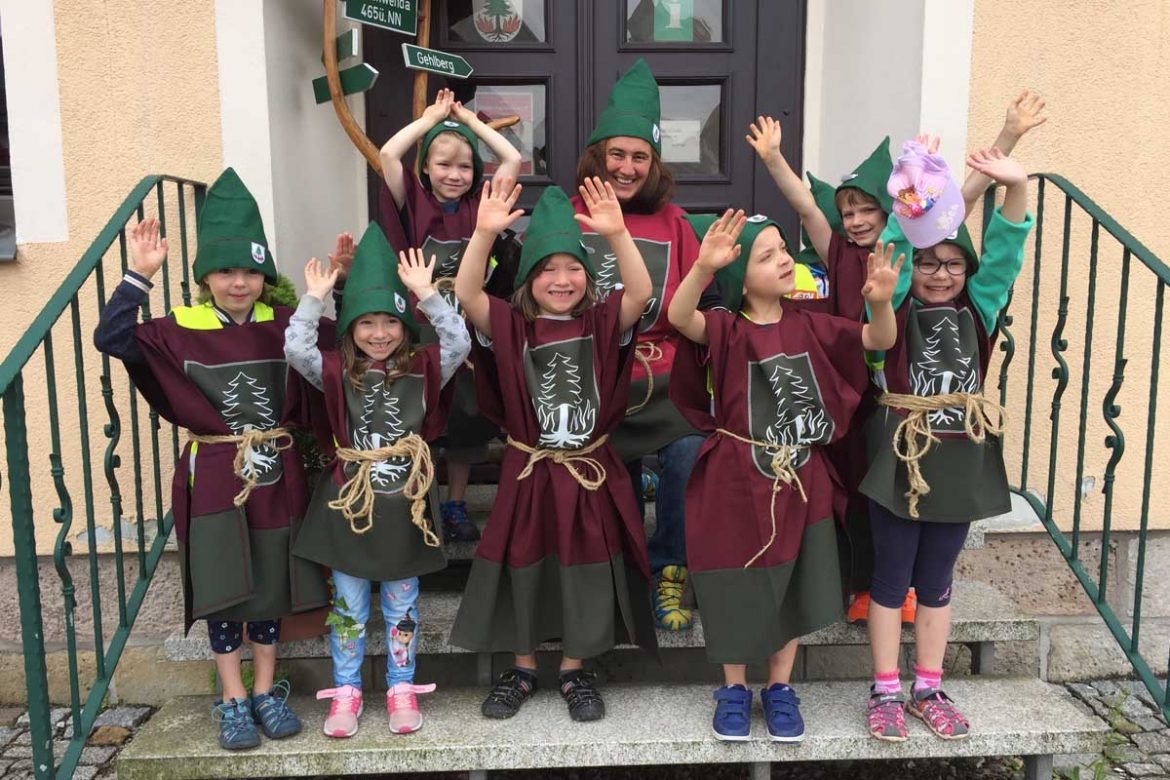 Zum Abschluss vor der Heimatstube riefen die Kinder „Schwäng, Schwäng Schwoarterutsch“ und wünschten sich eine schöne 70-Jahrfeier im Kindergarten.