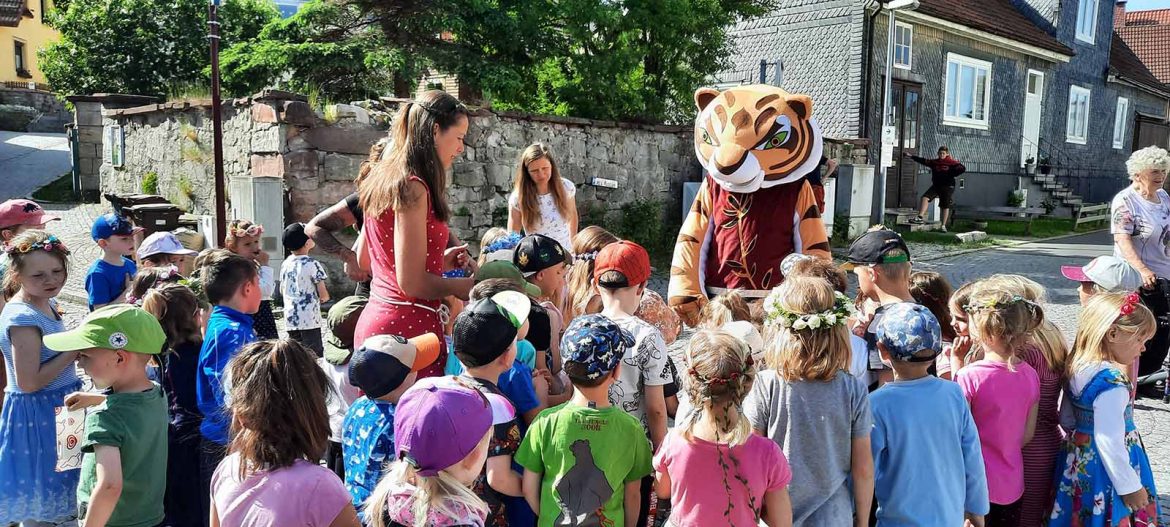 Am Donnerstag feierten die Kinder ihren Tag, den Kindertag und ließen eine alte Tradition wieder aufleben. Mit buntgeschmückten Stäben, Blumenkränzen und lustiger Musik zogen sie zum Dorfplan. Dort angekommen wurde gesungen und getanzt bis ein Überraschungsgast erschien. Ein als Tiger verkleideter Kita- Papa überbrachte den Kindern Eis, welches ihnen vom Inhaber des EDEKA Marktes Ronny Heinrich geschenkt wurde.