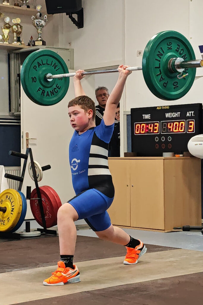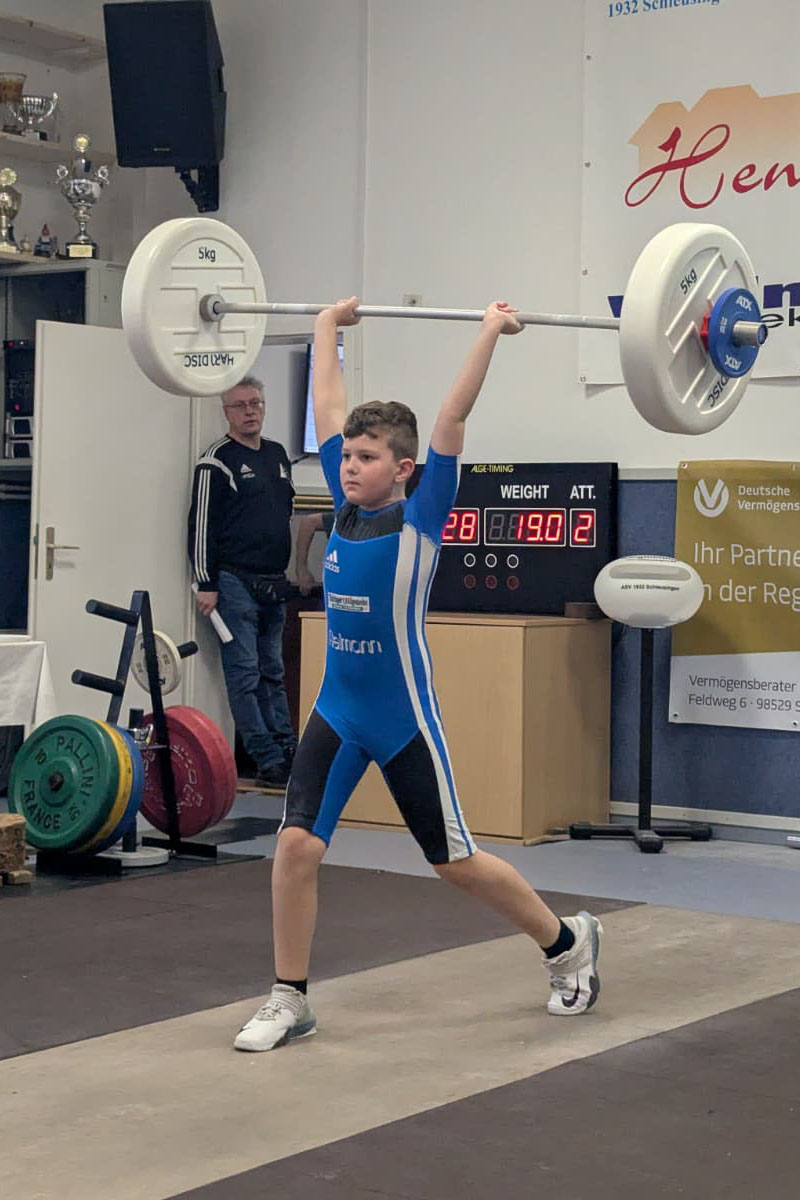 Anton Geuther lieferte sich im Jahrgang 2015 leichte Gruppe einen packenden Wettkampf mit Ragnar Schneider vom Ohrdrufer SV. Anton gewann das Reißen und führte lange im Stoßen. Die Entscheidung im dritten Versuch. Während Anton leicht nachdrückte meisterte Ragnar seinen Versuch. Anton führte noch mit 2,93 Punkten aber das reichte nicht da Ragnar im Schlussweitsprung 11 cm weiter sprang. So wurde er Zweiter. Fünfter wurde Jakub Kulaj vor Friedrich Hoffmann.