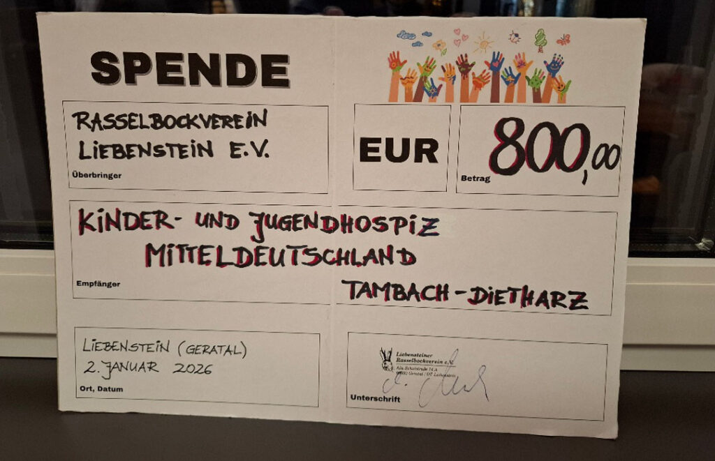Traditionell wanderte nach dem Theaterstück der „Hut“ für den guten Zweck durch den Saal. Überwältigt vom Anklang der Spenden entschlossen wir uns spontan, die gespendete Summe des begeisterten Publikums zu verdoppeln. Wir als Verein hielten Wort und übergaben in der ersten Woche des neuen Jahres 2026 die Spendensumme von 800 EUR an das Kinderhospiz Tambach-Dietharz. Vor Ort bekamen einige Vereinsmitglieder ein Bild von der wertvollen Arbeit. Das Kinderhospiz ist ein besonderer Ort für Familien mit unheilbar erkrankten Kindern. Mit Hilfe der Spenden schafft das Hospiz Momente der Geborgenheit und begleitet Betroffene in der schweren Zeit.