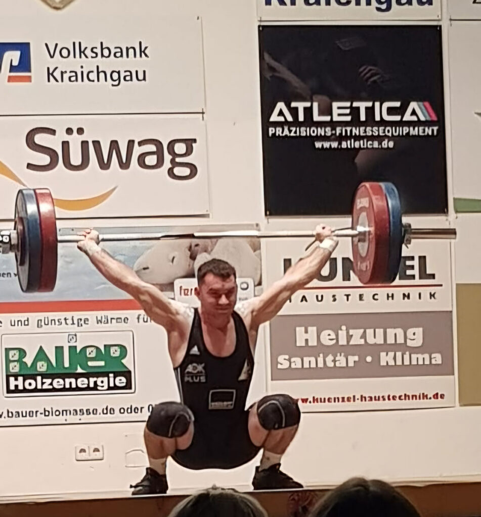 Jetzt der entscheidende Versuch von Marc 153 kg, kraftvoll setzte er diese Last um und nach dem unglaublich guten Ausstoß schrie er seine Freude heraus. Das war der Versuch wo Heinsheim sich die Zähne ausbeißen sollte. Neuer Landesrekord ohnehin. Alle 3 Heinsheimer steigerten trotzdem auf Sieg aber der Vorsprung der Gräfenrodaer war jetzt zu groß. Der Zweikampfpunkt sicher. Alle 3 scheiterten an ihren hohen Lasten. Heinsheim gewann das Stoßen mit 413 zu 385,8 Relativpunkten.