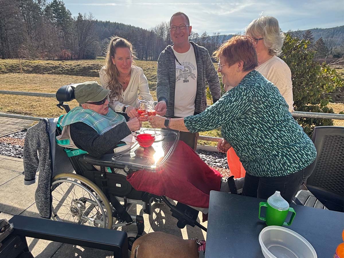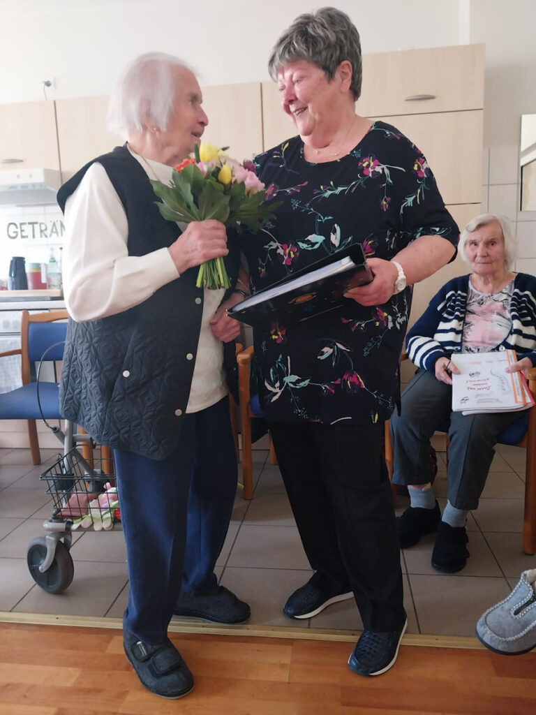 Nur wenig später stand ein weiterer festlicher Höhepunkt auf dem Programm: Die Bewohnerinnen und Bewohner kamen in geselliger Runde zusammen und stießen mit Sekt auf die Frauen an. Im Rahmen der Feierlichkeiten wurde Frau Sebastian, die Chohrleiterin unserer Einrichtung, mit einem besonderen Dankeschön für ihr langjähriges Engagement und ihren wertvollen Beitrag zum kulturellen Leben bedacht.