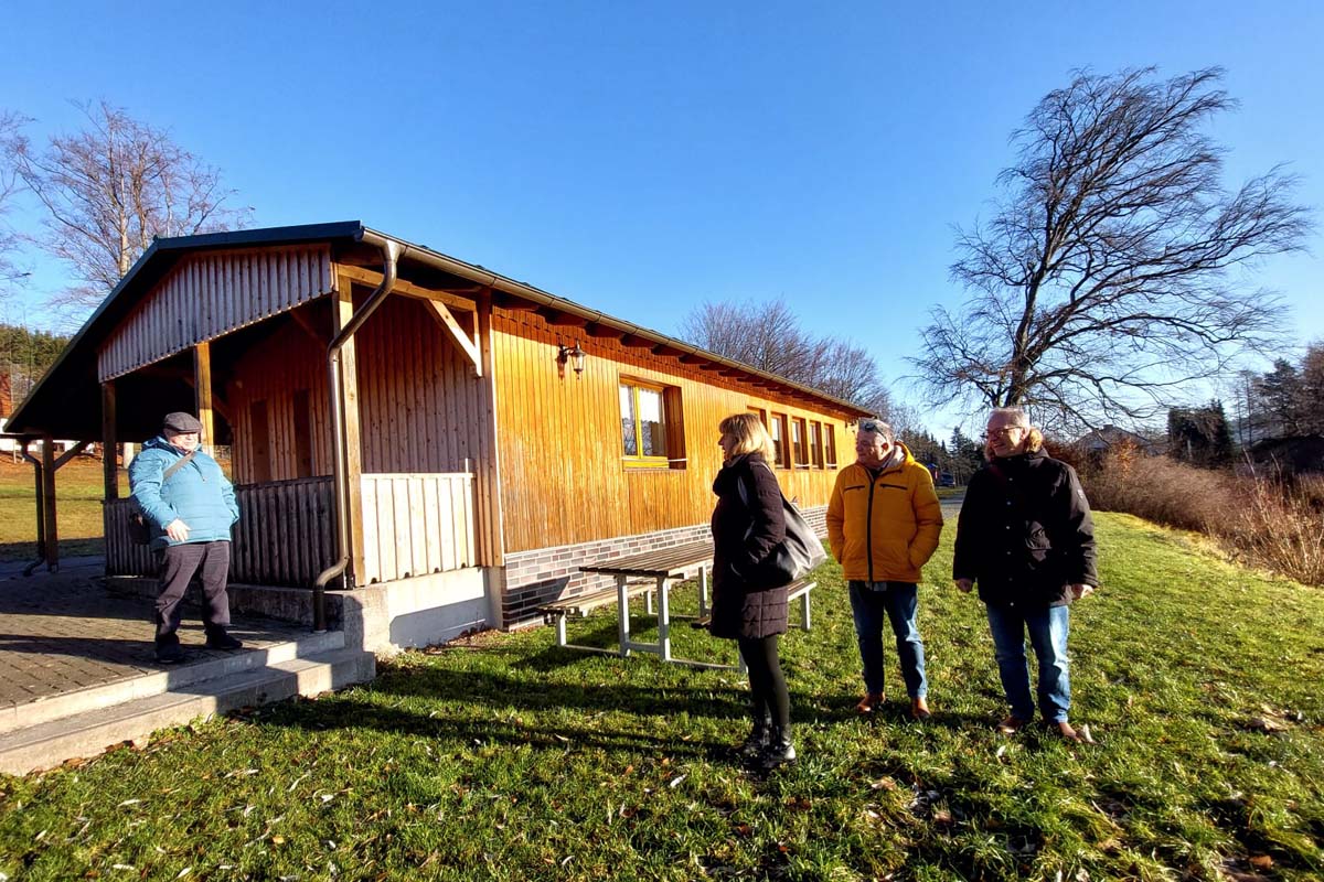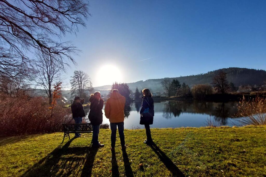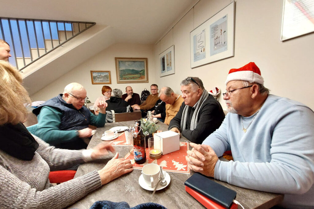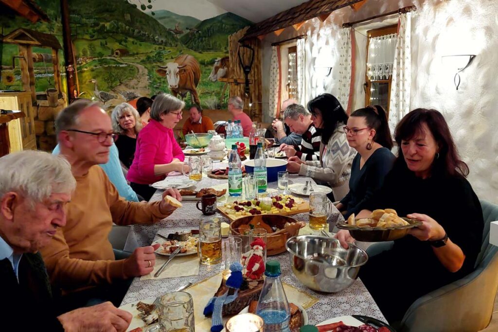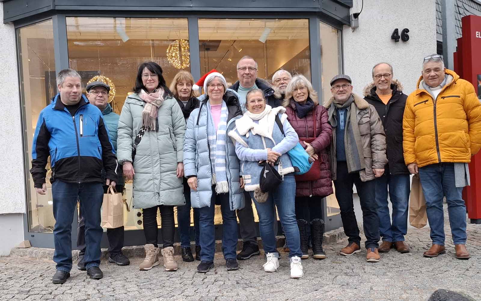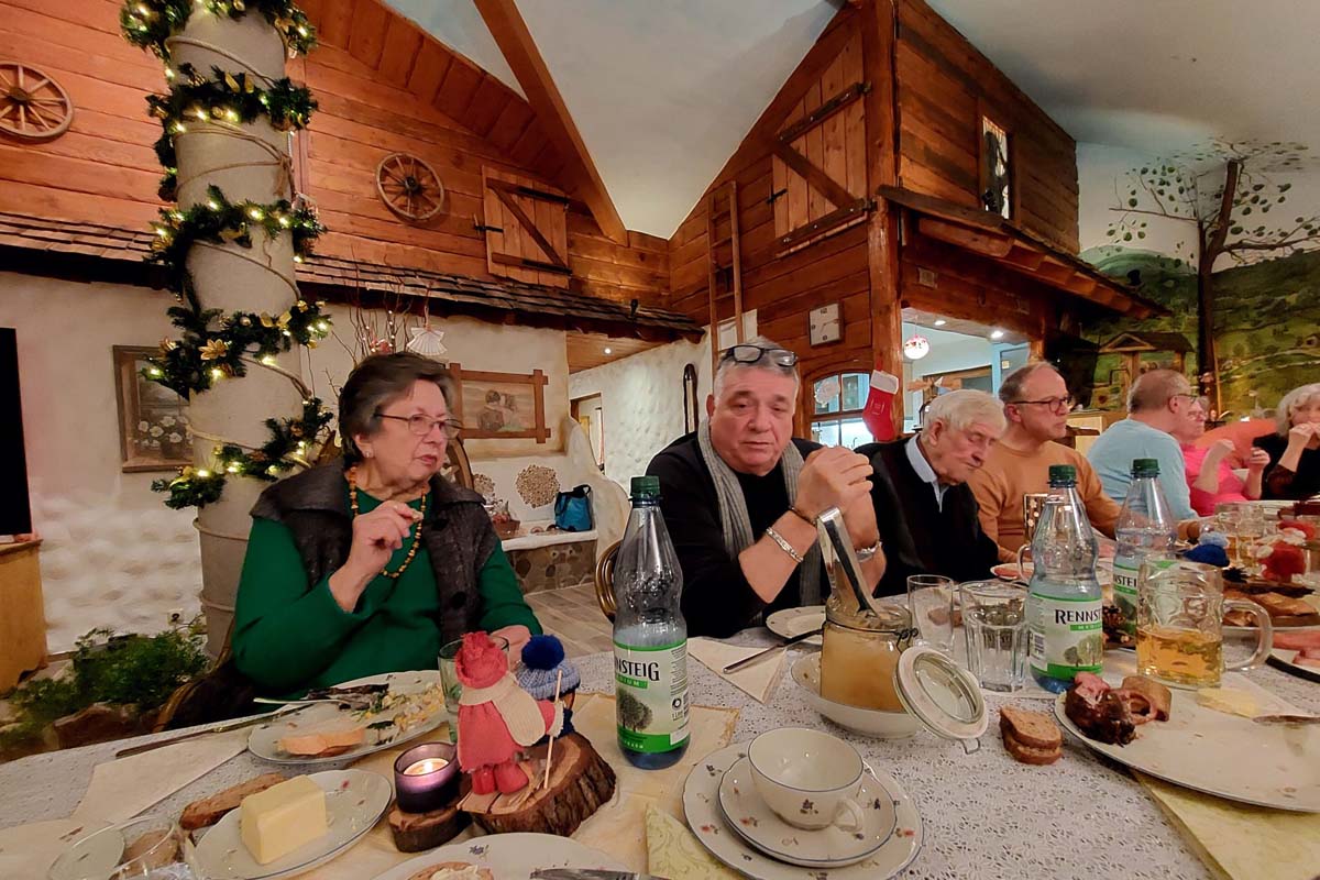Gut gelaunt kamen unsere Morbacher und Franzosen am Freitag, einen Tag vor dem Weihnachtsmarkt, an. Wir begleiteten sie in ihre Übernachtungshäuser beim Jens Hertwig. Auf Anhieb fühlten sie sich pudelwohl, wie in einem Märchen hier oben, war die Meinung unserer Gäste. Die Bäume waren weiß gezuckert und eine mystische Stille lag über dem Tal. Per Beine ging es zum Kaffeetrinken zu Daniela ins Mühlencafé. Nach dem langen Sitzen im Bus ein willkommener Ausgleich. Die Chefin hatte gut eingeheizt und wir durften am Öfchen Platz nehmen. Wir fühlten uns heimelig aufgehoben und die schöne weihnachtliche Dekoration tat ihr übrigens dazu. So nach und nach füllte sich die gedeckte Tafel, denn einige Bürger aus Geraberg kamen gerne hinzu, um unsere Gäste kennenzulernen. Bei Kaffee und Kuchen und dem warmen Öfchen im Rücken wurde es ein geselliger Nachmittag. Noch ein bisschen Bewegung musste sein und somit entschlossen sich einige nicht mit dem Auto, sondern per Fuß zum nächsten Treffpunkt zu gehen. Ein guter Gedanke, denn so konnten wir ihnen unseren neu gestalteten Kreisel zeigen. Die Begeisterung dafür war unseren Gästen anzusehen und auch ein Blick hinauf zu der Schwedenhütte ließ sie staunen. In solchen Momenten wird einem, als Bürger von Geraberg, wieder einmal bewusst, wie schön unser Dorf ist und was man alles gemeinsam schaffen kann.