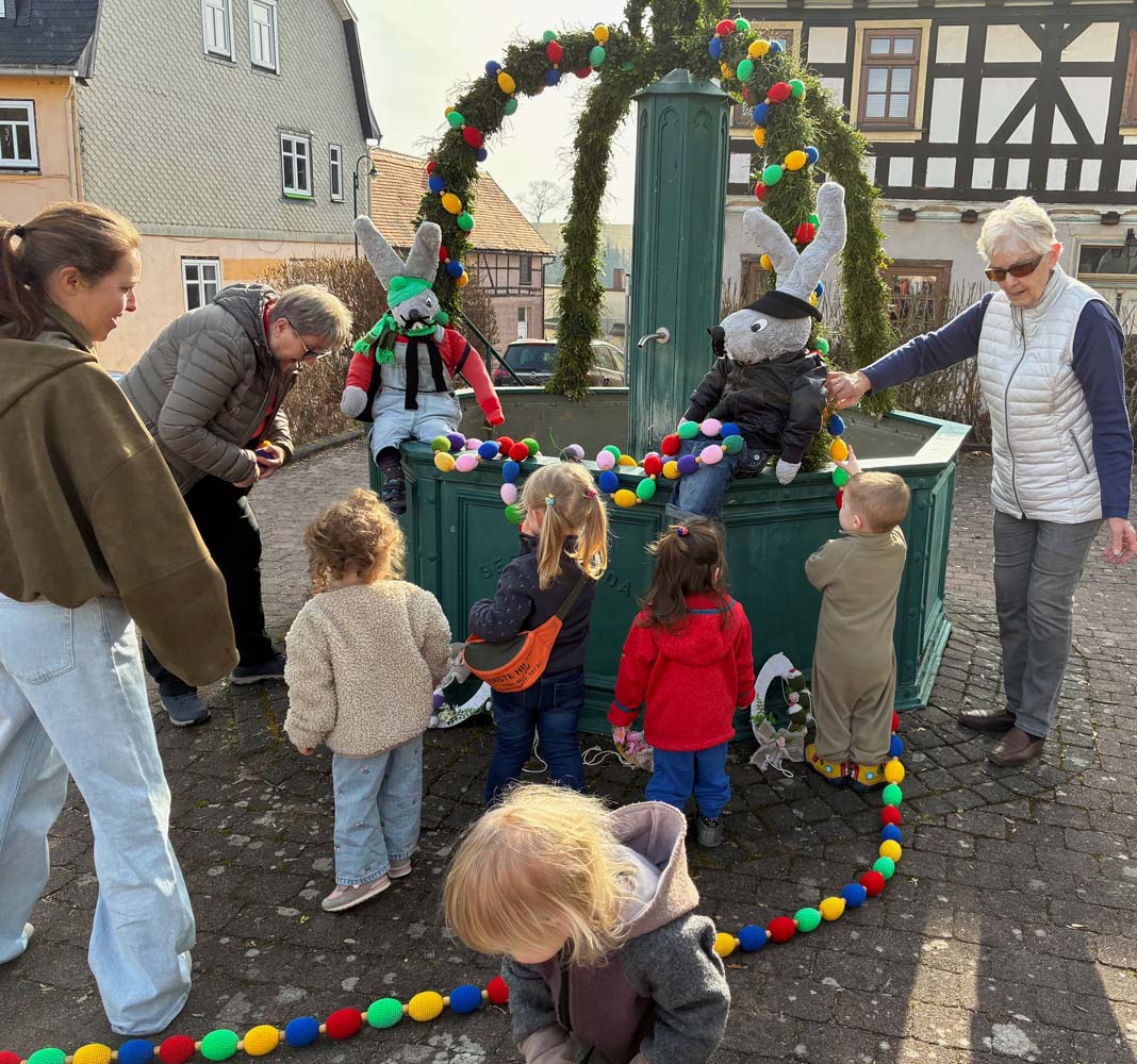 Schon die Vorbereitung hat gute Tradition. Die Osterkrone haben Ingrid Heyer und die aktiven Helfern mit frischem Buchsbaum umwickelt. Auch die Kinder der Kita „Pfiffikus“ sind beim Schmücken des Osterbrunnen, der Bäume und Sträucher dabei. So manches schöne Osterei findet erst durch die Kinderhände den richtigen Platz.