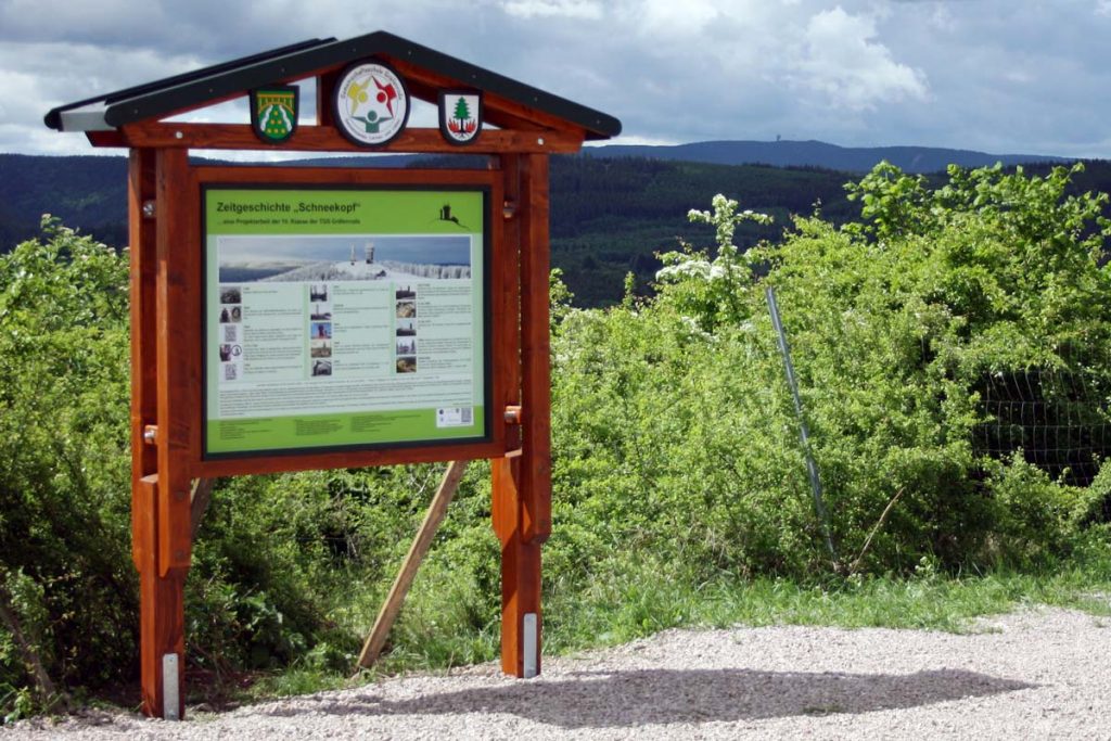 Für die mündliche Verteidigung hatten Linus und Richard 15 Minuten Zeit, ihre 54-seitige Projektarbeit vorzustellen. Sie veranschaulichten ihren Vortrag mit der „Kleinsten Steinkugel der Welt“ (Schneekopfkugel), QR-Codes und Musik. Das eigentliche Hauptthema ihrer anderthalbjährigen Recherche war der „Kalte Krieg“, auf den sie an diesem sonnigen Tag jedoch nicht genauer eingehen wollten. Im Vordergrund standen klar die Zeitgeschichte zum „Schneekopf“ sowie das Präsentieren der Informationstafel und der Waldschänke.