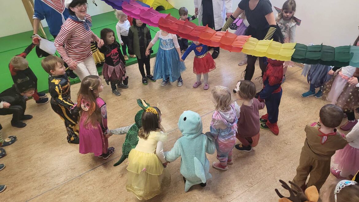 Die Kinder und ErzieherInnen der 3 älteren Gruppen machten sich in einer Polonaise auf den Weg, die Jüngsten abzuholen. So zog die riesige bunte und fröhliche Schlange los Richtung Mehrzweckraum, wo jeder Faschingsgast zum Tanzspiel „UND WER ALS … GEKOMMEN IST, TRITT EIN, TRITT EIN, TRITT EIN…“ zuerst sein Kostüm vorstellen durfte.