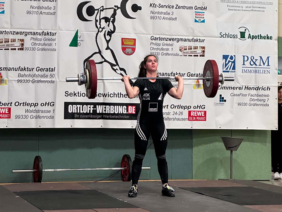 Lotta Frank schaffte im dritten Versuch starke 68 kg und damit 92 Relativpunkte insgesamt. Angelina Stenzel machte es im Stoßen wesentlich besser und schaffte 84 kg. Gräfenroda führte mit 151,5 zu 115,5.