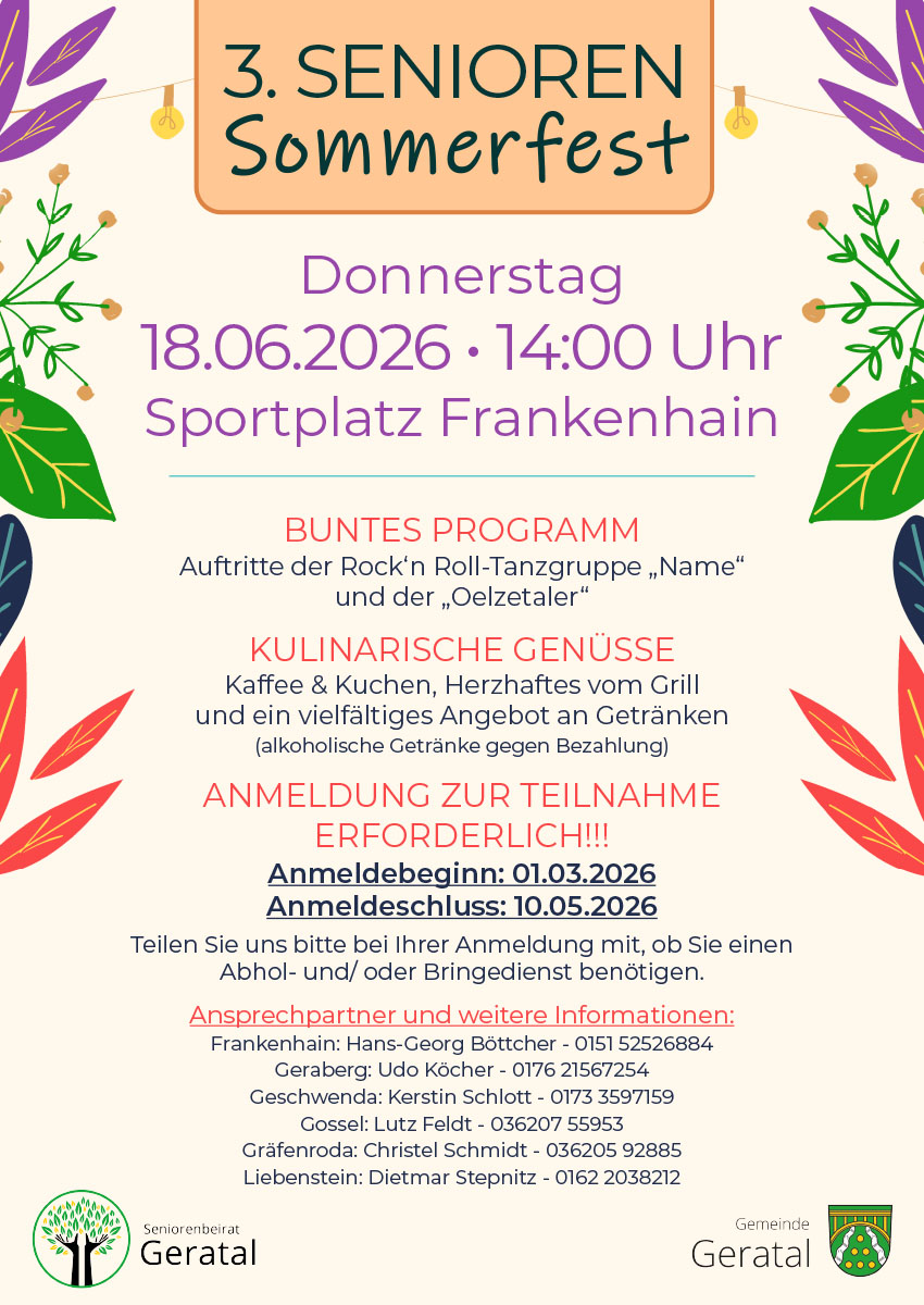 Ort: Gemeindesaal, Neue Sorge 1, 99331 Geratal OT Geschwenda