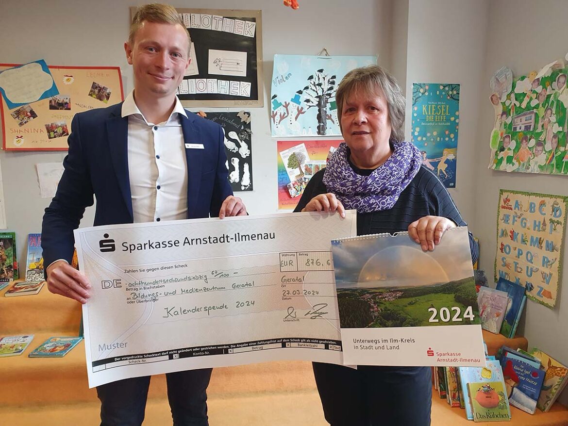 Unlängst konnte sich das Bildungs- und Medienzentrum Geratal über eine Spende freuen, die von Sascha Wolf, Leiter des Sparkassen-Geschäftsstellenbereiches Geratal, an Leiterin Petra Neumann übergeben wurde. Die Spende, in Höhe von 876,67 EUR stammt aus der Vergabe des Sparkassen-Bildkalenders der Geschäftsstellen Gräfenroda und Geraberg, die traditionell mit einer Spendenaktion für ein regionales Projekt verbunden wird.