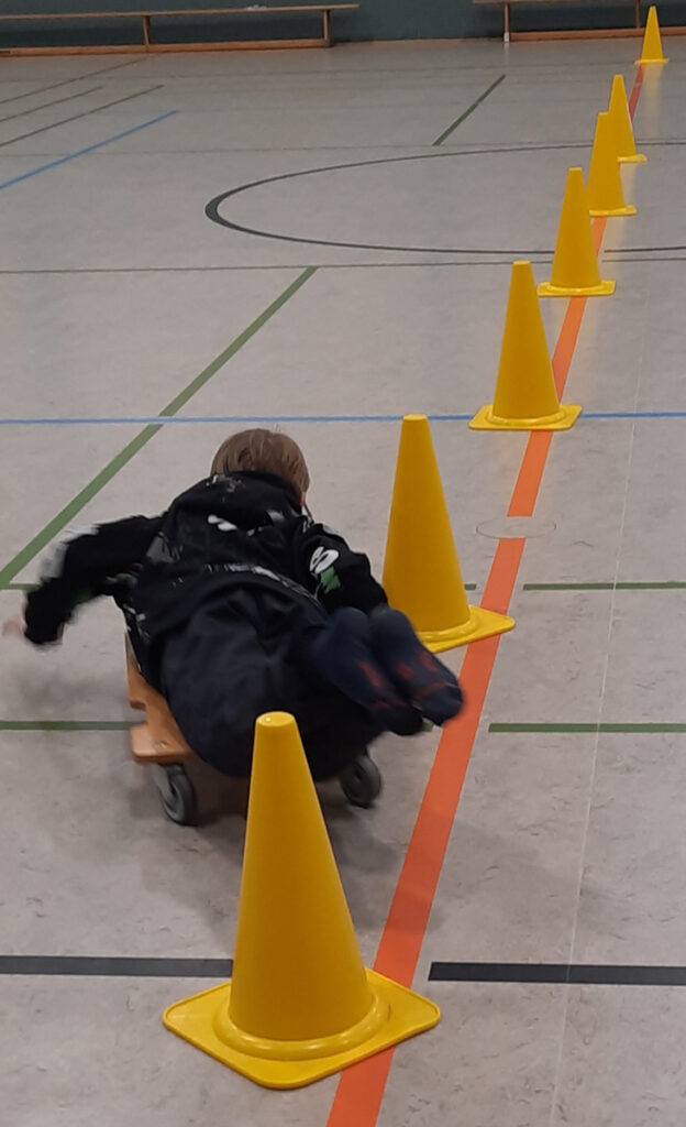Auch den Winter holten die Sportlehrer in die Turnhalle. So konnte man sich im Skilanglauf auf einem Rundkurs oder Skeleton mit dem Rollbrett ausprobieren.
