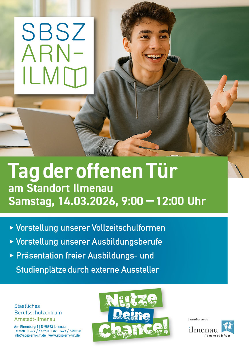 In Vorbereitung auf das neue Lehr- und Ausbildungsjahr lädt das Staatliche Berufsschulzentrum Arnstadt-Ilmenau am Samstag, dem 14. März 2026, von 9:00 bis 12:00 Uhr wieder zum Tag der offenen Tür ein. Wir freuen uns, an diesem Tag in Ilmenau, Am Ehrenberg 1, alle Interessenten, vor allem die Regelschüler der 9. und 10. Klassen mit ihren Eltern, begrüßen zu können.