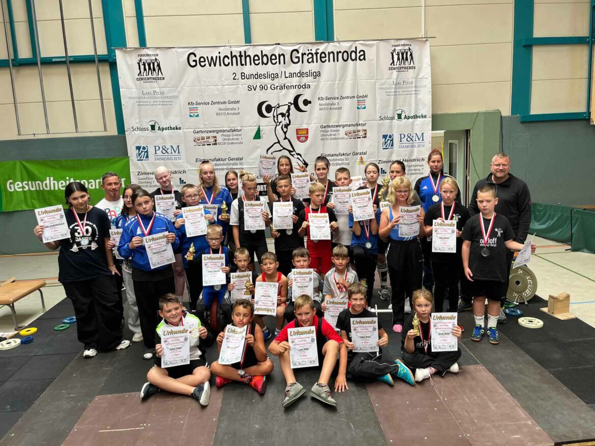 An den Thüringer Landesmeisterschaften der Kinder, Schüler und Jugend am 14. September 2024 in der Sporthalle Wolfstal nahmen 58 Sportler teil. Vor über 200 Besuchern, darunter den vielen Sportlern, Eltern und Helfern fanden die diesjährigen Meisterschaften statt. Die Gräfenrodaer waren hervorragende Gastgeber und räumten auch noch groß ab denn es blieben 12 mal Gold,4 mal Silber und 3 Bronzemedaillen bei den 23 Teilnehmern vom SV 90. Die von Rolf Heyer und seinem Bruder liebevoll gestalteten Zwergenpokale waren ein weiteres Highlight an diesem Tag.