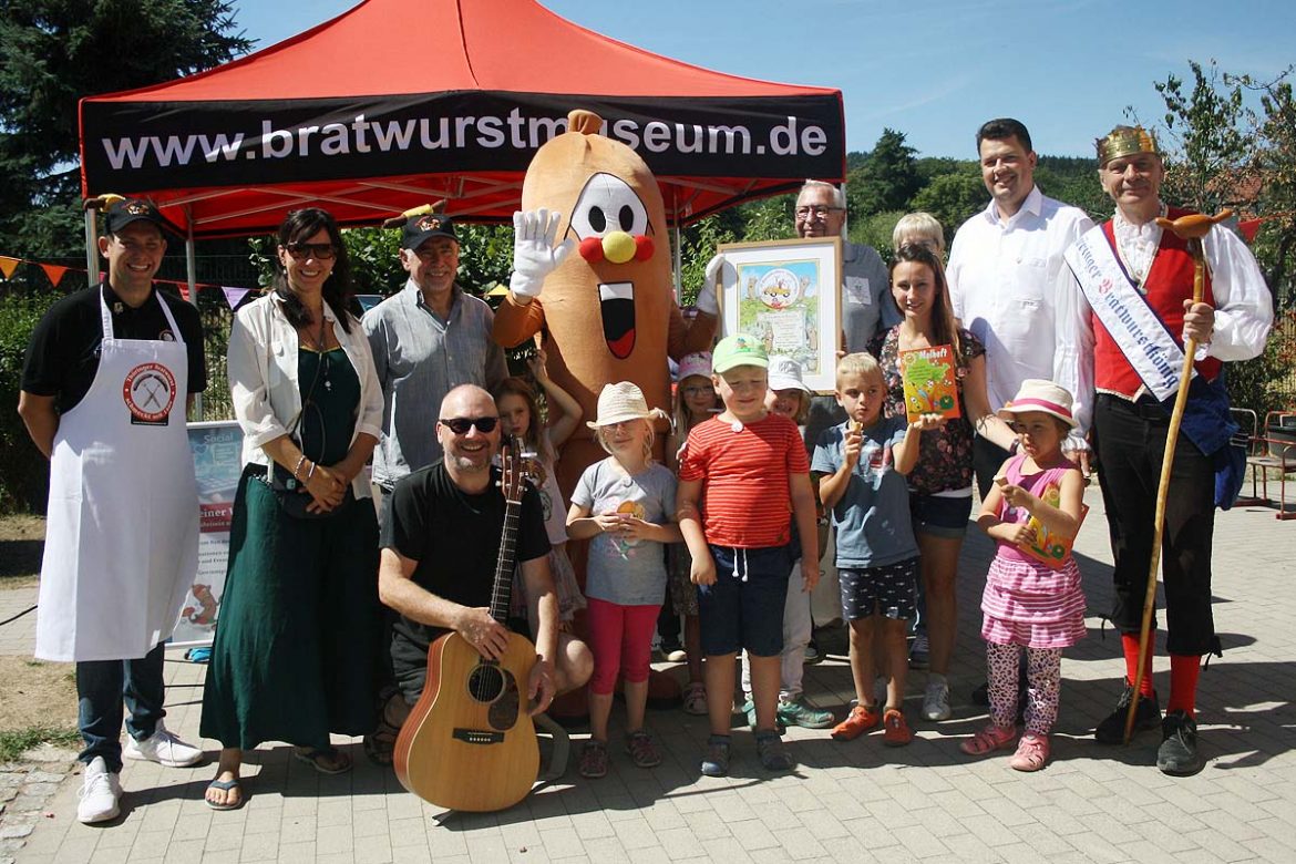 Zu Gast waren auch der 1. Beigeordnete der Gemeinde Geratal, Herr Tobias Nimbs, und Mitarbeiter der Gemeindeverwaltung. Selbstverständlich erschien auch der „Thüringer Bratwurstkönig“ Norbert Abt höchstpersönlich. Er tummelte sich mit unter das kleine Volk, erzählte Geschichten aus seinem Bratwurst-Königreich und gab eine Autogrammstunde. Die Stärksten durften sogar das große und schwere Bratwurstzepter halten.