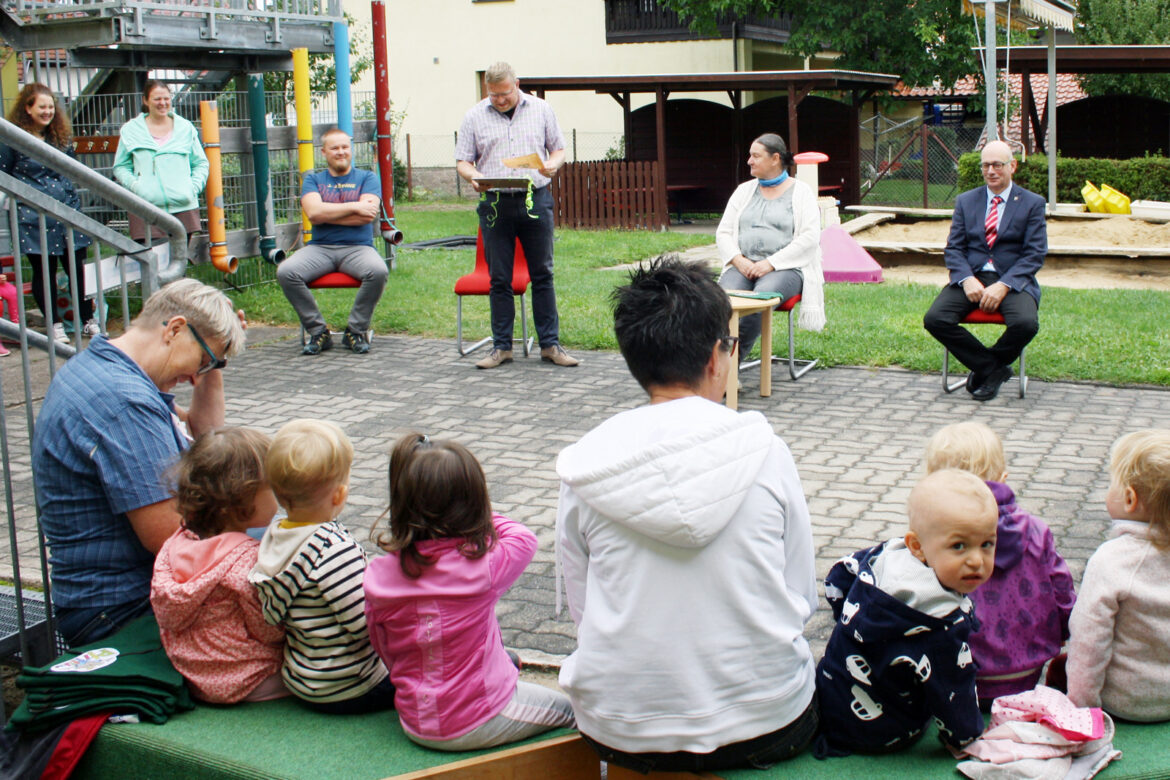 Nach diesem sportlichen Auftakt kam unser Bürgermeister Dominik Straube zum Zug. Er begann damit, eine so sportliche Einlage leider nicht einstudiert zu haben, dass er seinen Dank jedoch mit ein paar Worten aussprechen möchte. Er zog eine Urkunde und eine Rede hervor, welche er Frau Hofmann vortrug. Alle hörten gespannt zu und Frau Hofmann freute sich sichtlich über das Resümee der vergangenen 20 Jahre als Kindergärtnerin. Im Anschluss überreichte er ihr die Urkunde sowie ein Blumenbouquet und bedankte sich für den langjährigen Dienst in der KiTa „Pfiffikus“. Ortschaftsbürgermeister Berg Heyer schließt sich den Worten an und bedankt sich ebenfalls mit herzlichen und ehrbaren Worten bei Iruta Hofmann.