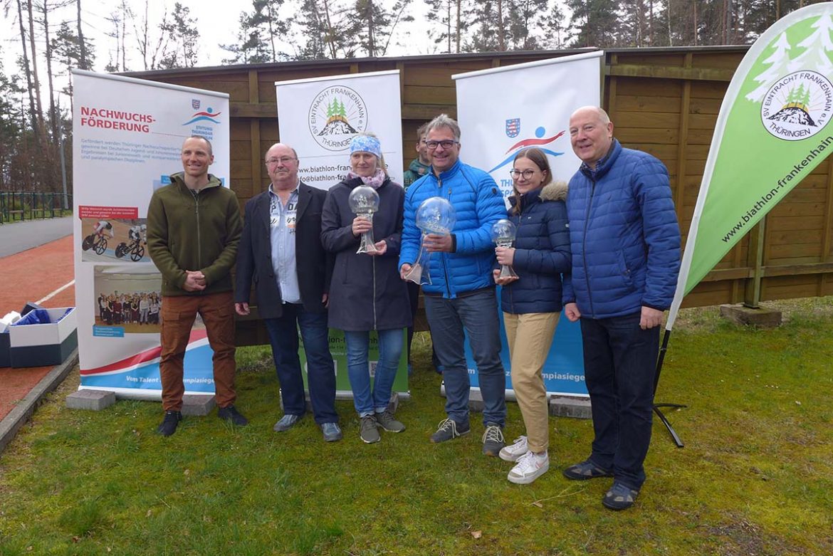 Auf dem Vereinsgelände des SV Eintracht Frankenhain e.V. fand vor wenigen Tagen die feierliche Übergabe statt. Die Vereinsvorsitzende, Olympiasiegerin Katrin Apel, einer der erfolgreichsten Sportler des SV Eintracht Frankenhain e.V., der Olympiazweite Erik Lesser, und Glasbläsermeister Herbert Reuß überreichten die drei WM-Pokale an Andreas Reiche und seine Tochter Elisa, die begeisterte Biathlon-Fans sind.