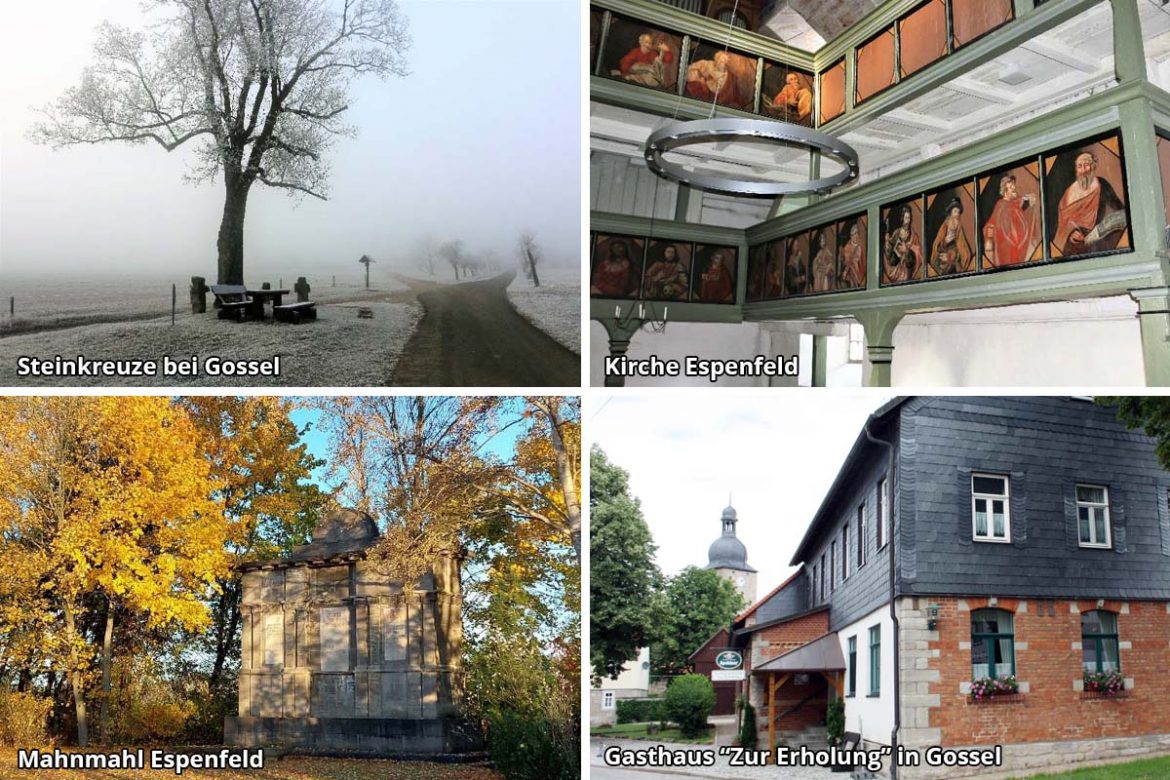 Espenfeld, Mahnmal ‐ NSG Gottesholz, Ebanotte, Sühnekreuze Gossel, Gossel ‐ Jonastal ‐ ehemalige Stollen im Jonastal ‐ Espenfeld, Wehrkirche ‐ Mahnmal