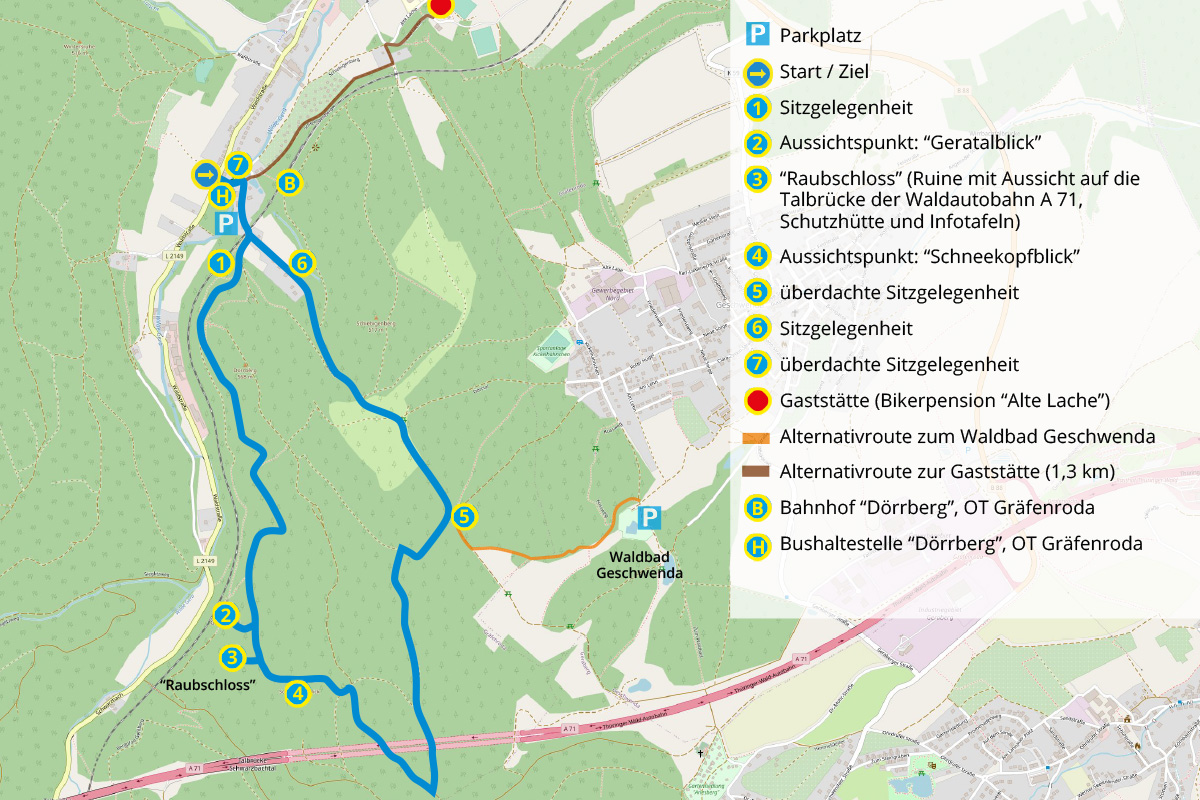 Die Wanderroute eignet sich perfekt für eine Halbtagestour und ist gut mit Bus und Bahn erreichbar. In der Nähe des Startpunktes befindet sich das älteste Haus Gräfenrodas und ein wunderschöner Schwanenteich. Am „Raubschloss“ selbst wurde die Ruine rekonstruiert, und eine Schutzhütte bietet sich dort zur Rast an. Infotafeln entlang des Weges geben weitere Informationen über diesen Ort. Der Wanderweg führt durch die unberührte Natur des schönen Thüringer Waldes und ist daher ein Geheimtipp!