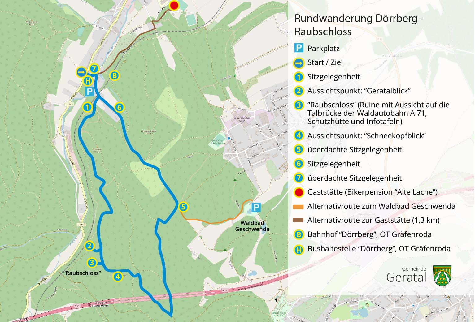 Das Raubschloss ist von den Ortschaften Gräfenroda (Dörrberg), Geschwenda, Gera-berg und Gehlberg gut zu erreichen. Wenn man von Gräfenroda (Dörrberg) startet, verläuft der ca. 6 km lange Rundwanderweg vom Viadukt am Dörrberg aus in Richtung „Ruine Raubschloss“. An der nächsten Wegekreuzung folgt man der Beschilderung und biegt rechts ab in Richtung „Raubschloss“. An einer weiteren Wegekreuzung nimmt man den steilen Trampelpfad nach links hinauf. Obwohl der Aufstieg etwas mühselig ist, wird man mit einem wunderschönen Blick auf die Bogenbrücke der Waldautobahn A71 und die Bahnstrecke mit dem sogenannten „Brandleitetunnel“ belohnt.