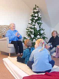 Los ging es 10 Uhr. Die Kinder saßen ganz artig auf Matratzen und lauschten aufmerksam dem erzählten Märchen von unserer Bewohnerin Frau Ursula Mühlmann. Die Kinder waren so begeistert, dass es nicht nur bei einem Märchen blieb. So schlugen sie vor, welches Märchen sie noch kennen und welches sie noch