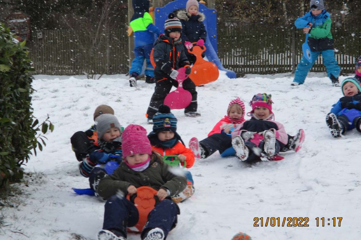Lange mussten unsere Kinder auf den ersten Schnee warten, doch umso größer war die Freude, als dieser dann unseren Kita Garten in eine Rodelbahn verwandelt hat. In ihren Gruppen traten die Kinder beim Popo – Rutscher – Wettrennen gegeneinander an. Wie es sich gehört, gab es am Ende für alle Kinder eine Medaille, welche sie stolz präsentierten. Die Krippenkinder absolvierten währenddessen ein Schneeschaufel – Training.