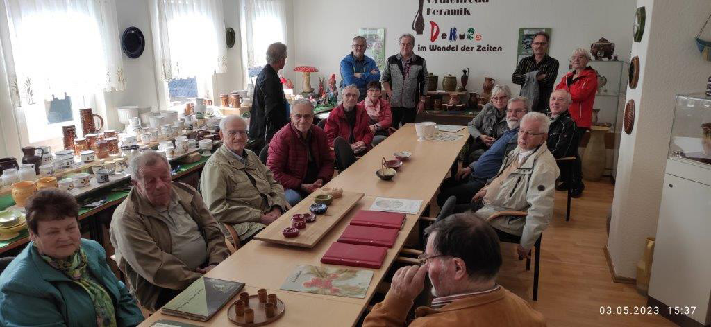 Also trafen wir uns bei schönem Wetter, um 15.oo Uhr vor unserem Museum. Zunächst schauten sich meine ehemaligen Kollegen unsere schön gestaltete Sonderausstellung: Gräfenrodaer Keramik – Dekore im Wandel der Zeiten an. Diese mit vielen Exponaten der früheren Fa. Carstens und späteren VEB Keramik Gräfenroda ausgestattete Ausstellung war ein echter Hingucker! Insbesondere zeigten die anwesenden Frauen ein großes Interesse.