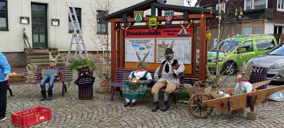 Nun ist es soweit, um unsere Hasenfamilie zum Schauplatz zu bringen. Es gibt wieder gute Ideen den Plan österlich aussehen zu lassen. und von einige Frankenhainern wurden auch Eier gebraucht, um unsere Birken schön zu schmücken.